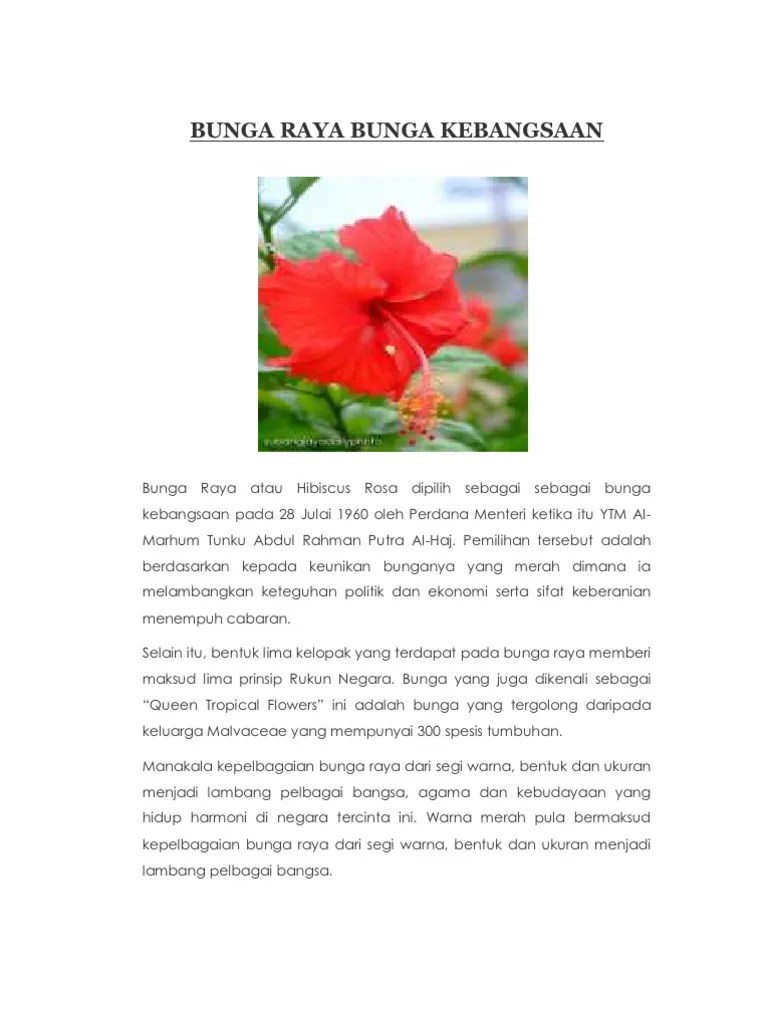 Bunga raya, bunga kebangsaan malaysia bunga raya, juga dikenali sebagai bunga. Bunga raya juga dipilih sebagai lambang kebanggaan berdasarkan kepada beberapa sifat bunga raya yang unik. • kelopak bunga raya melambangkan perpaduan rakyat malaysia yang berbilang kaum, selaras dengan prinsip rukun negara . Bunga ini adalah bunga kebangsaan yang digunakan dalam upacara rasmi dan